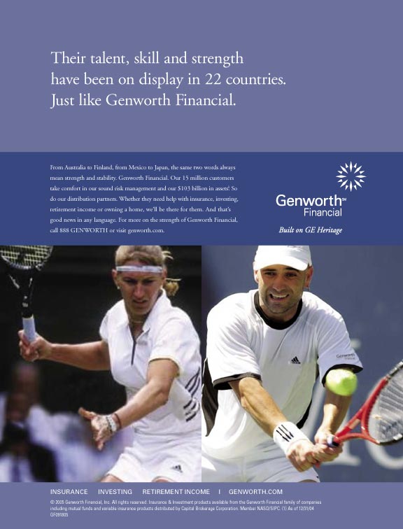 En 2005, à l'attaque de l'US Open Genworth Financial met les bouchées doubles aux USA avec une campagne à la TV et dans la presse. L'idée : les assurances et les investissements peuvent représenter pour certaines personnes un univers complètement étranger… et étrange. Heureusement, Genworth est là pour les aider ! Le spot montre donc André et Steffi dans un pays fictif invités à participer à un double mixte aux règles… déconcertantes.