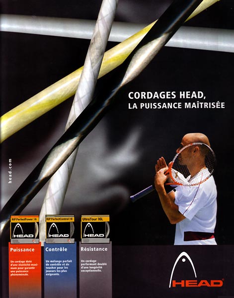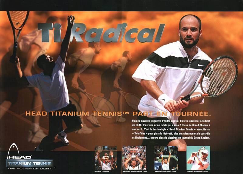 Au tout début de sa carrière, Agassi a d'abord utilisé des raquettes Prince, puis des Donnay durant quelques années avant de passer chez Head en 1992. Il a donc remporté quasiment tous ses Grand Chelem avec des raquettes Head. Logiquement, la société a souvent utilisé l'image d'Agassi pour ses publicités.